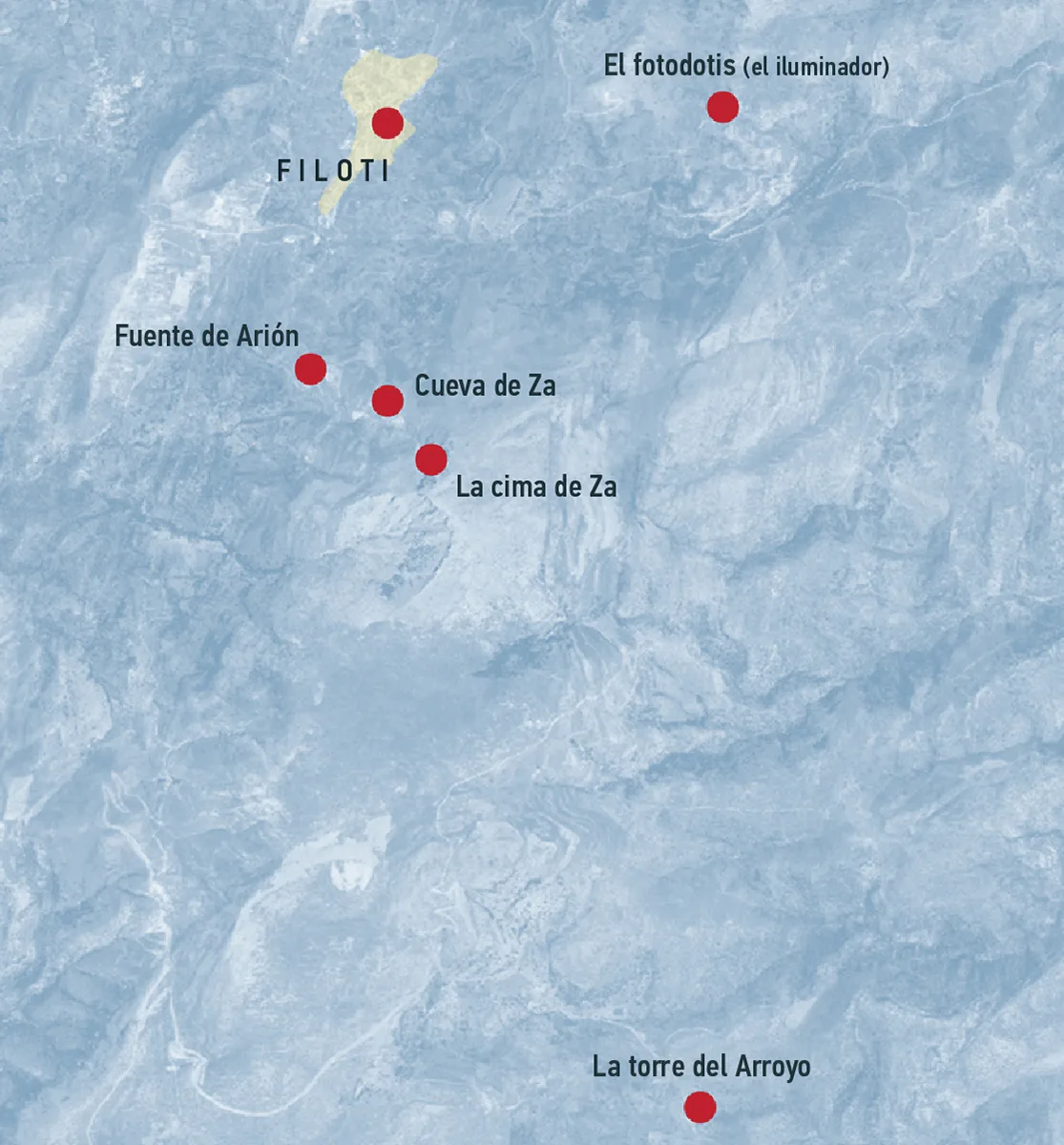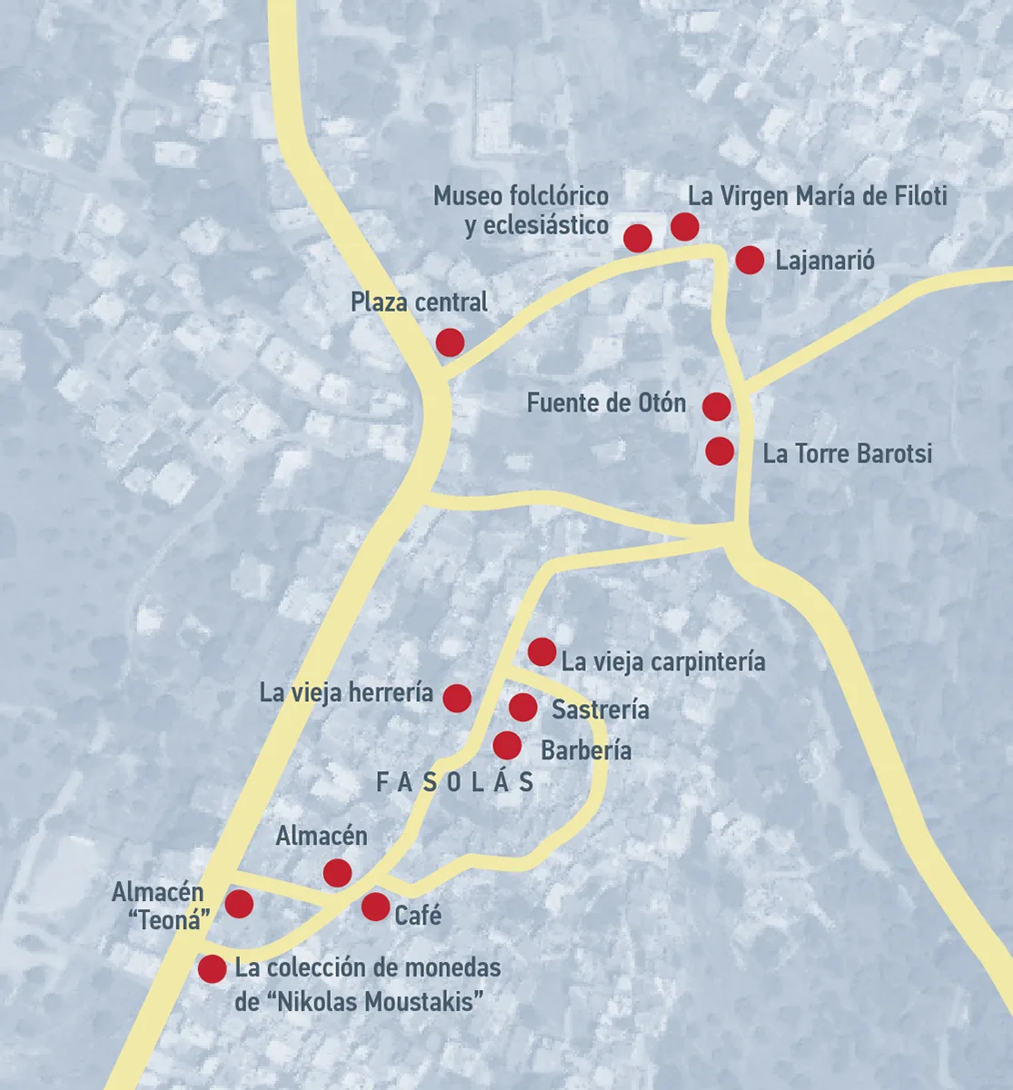 Plaza central («Géfira» que significa puente) • Vieja escuela/Iglesia de la Virgen Maria • Lajanarió • Fuente de Otón/Castillo de Barotsi • Fasolás • Museo numismático • Almacén de Teoná • Plaza central