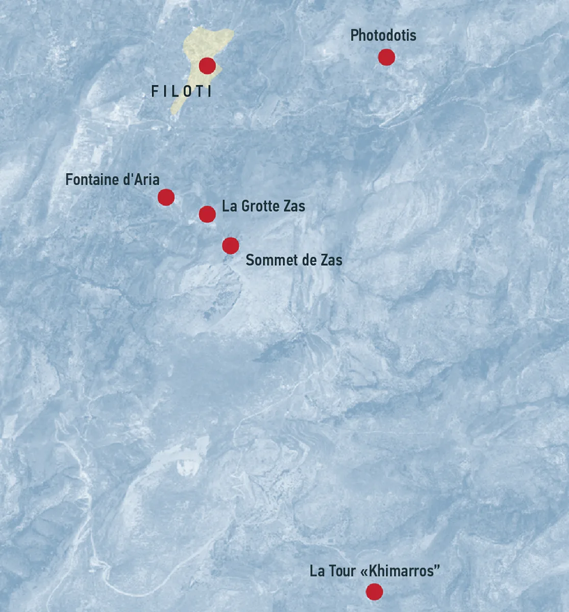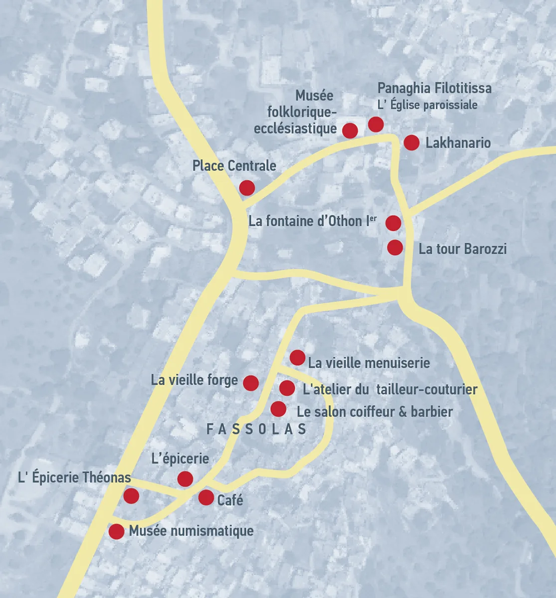 Place Centrale (“Gefyra”) •La Vieille École/Église paroissiale • Lakhanario • La fontaine d’Othon Ier/La tour Barozzi • Fassolas • Musée numismatique • L’Épicerie Théonas • Place Centrale