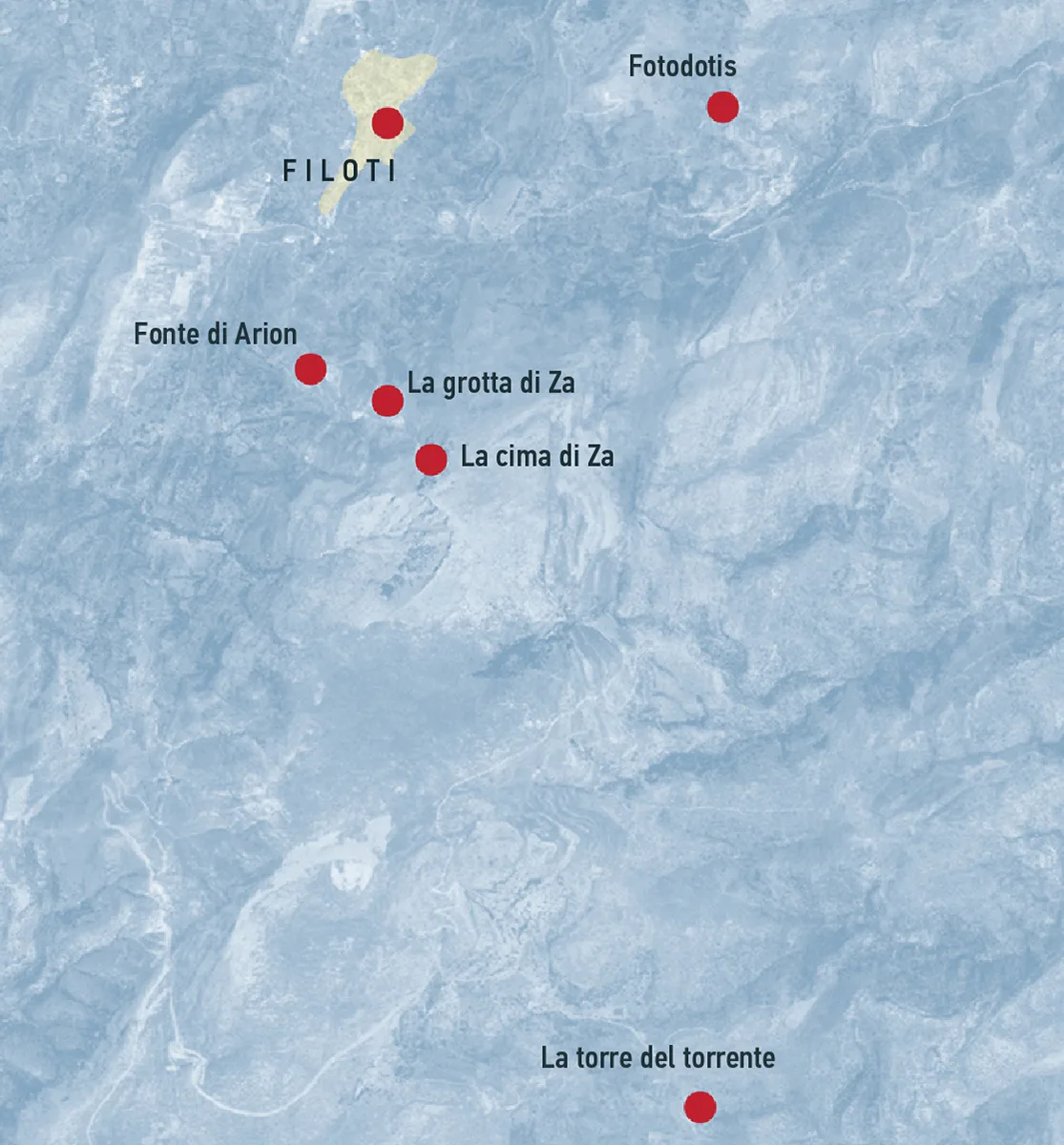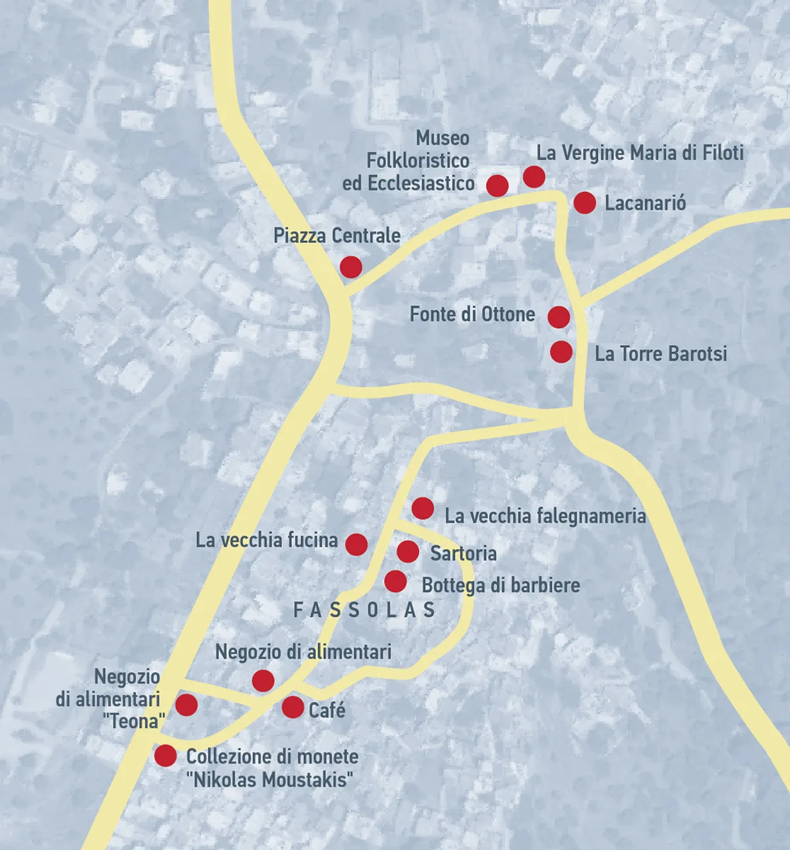 Piazza Centrale (“Géfiraˮ) • Vecchia Scuola/Chiesa della Vergine Maria • Lacanario • Fonte di Ottone/Torre Barotsi • Fassolas • Museo numismatico • Negozio di alimentari Teona • Piazza Centrale